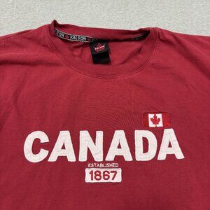 The Kalson Canada Long Sleeve T-Shirt is a men's XL size shirt in red and white stripes, featuring a crew neck and embroidered logo accents. Made of cotton jersey fabric, this machine washable shirt is perfect for the winter, fall, and spring seasons. The retro Canada theme adds a touch of personality to the garment, making it a stylish and comfortable choice for casual wear. Made in Canada by the brand Kalson True, this shirt is a great addition to any man's wardrobe.