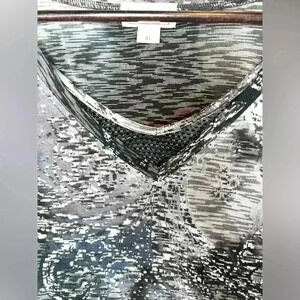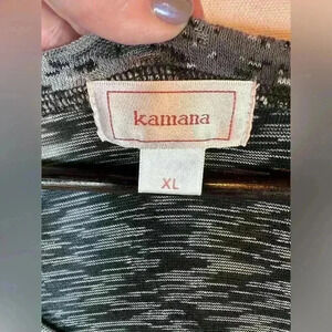Elevate your wardrobe with this stunning Kamana tunic top in size XL. The blue and black abstract pattern adds a touch of bohemian and retro vibe to the overall design. The classic/fitted sleeve and V-neckline make it suitable for any occasion, from casual to business, and the pullover closure makes it easy to wear.