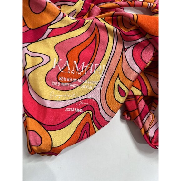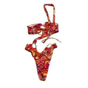 Description from retailer: The Madi Asymmetrical One Piece in Calico is a work of wearable art.Hot tropical colors of pinks, mango, and yellow turn up the sizzle factor. Madi combines the best of a cheeky bottom and bandeau top with exceptional asymmetrical styling. Artistic oval gold rings at each hip and in the center of the bandeau take Madi to the next level, while Kamari’s signature gold hardware completes the ties with style.