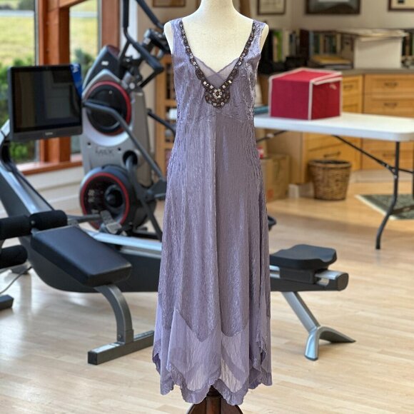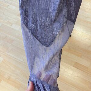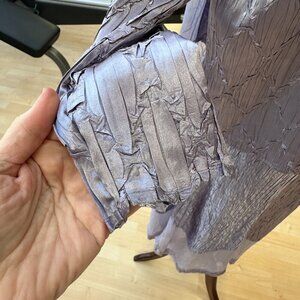 Luminous charmeuse is expertly hand-pleated and heat-set in this flattering dress with chiffon inserts, a beaded V-neck and a matching sheer jacket. It looks fabulous even without the jacket. Comes from my own closet in a smoke and pet free home. Tags were removed but never worn.