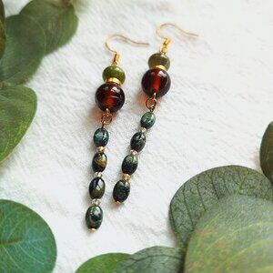 Ground yourself in earthy elegance with these handcrafted gemstone dangle earrings, featuring oval-cut Kambaba Jasper, green Tourmaline abacus stones, and warm brown Czech glass beads. The deep forest hues and organic textures create a perfect blend of goblincore, bohemian, and witchy aesthetics. Whether you're drawn to these gemstones for their grounding and protective energy or simply for their stunning, nature-inspired beauty, these earrings make a powerful statement.