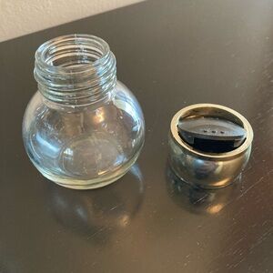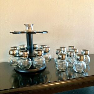 Kamenstein rotating spice rack with 16 clear glass jars and silver lids. Perfect for organizing your kitchen spices. The spinning rack stands approximately 9” tall and is approximately 9” wide. Each jar has 2 openings, one for sprinkling and one for measuring. The spice label on two jars is not visible. Offers are welcome on all items!