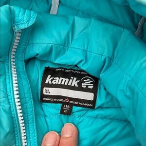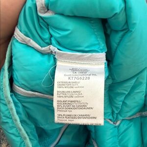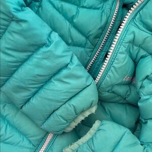 Vibrant aqua quilted jacket with hood. Features front zipper and button details.