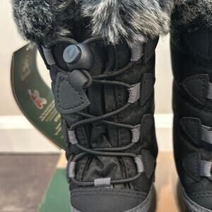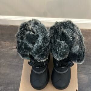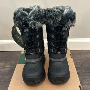 New with tags (NWT) and in original box Kamik Snow Gypsy 3 winter snow boot. Toddler girl size 9. Black and gray classic combination in a subtle monochromatic animal print will allow these trendy toddler boots to match any outfit. Can use bungee to cinch and tighten or loosen. Faux fur along top but also on interior, super soft and cozy boots.