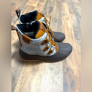 Kamik Simona Mid F boots are seam-sealed and waterproof, made with felt upper with genuine leather accents. Lace up style with waterproof inside zipper closure. Moisture wicking lining.