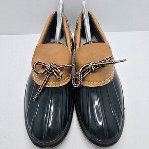TAGS: Womens, shoes, flats, rain boots, comfortable, casual, cozy, streetwear, sporty, waterproof, preppy, hunter green, tan, duck boots, East Coast, preppy, Collegiate