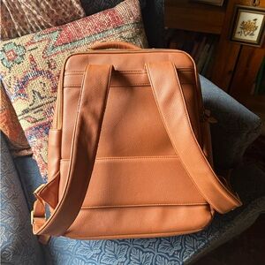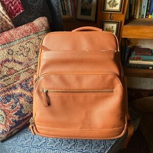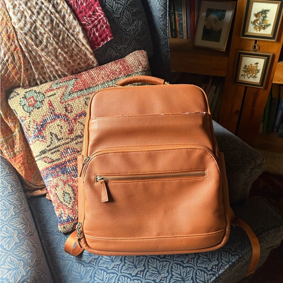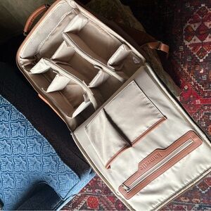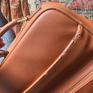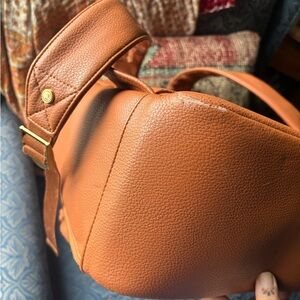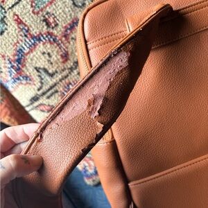 Stylish tan faux leather camera bag from Kamrette. Peeling as pictured on underside of strap and a little on edge of front zipper.