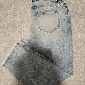 Kan Can, light acid wash, women's high rise distressed boyfriend jeans featuring frayed side split hem, classic 5-pocket design, and zip fly with button closure.