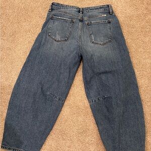 Barrel blue denim jeans with a button closure. Ideal for everyday style.