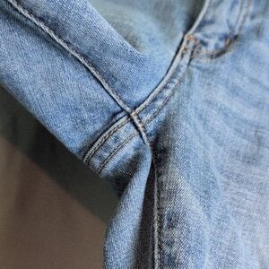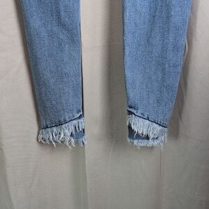 These KanCan jeans feature a classic light blue wash with a trendy distressed look, including a large knee rip and frayed hem. The ankle-cropped length adds a modern touch, making them perfect for casual outings.