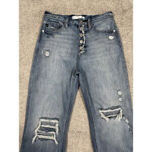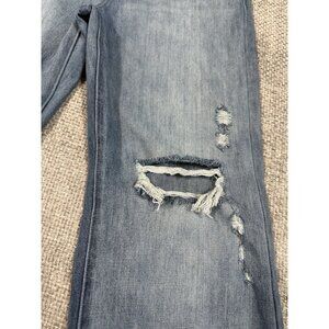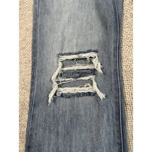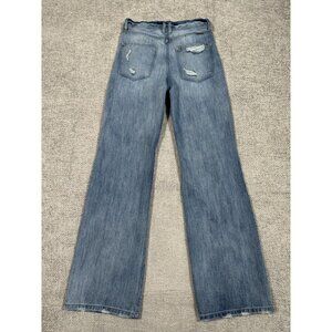 Stylish flare jeans with distressed details. Classic blue color. Perfect for casual wear.
