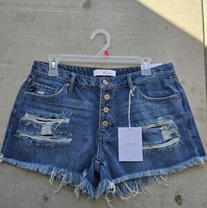 Embrace a vintage vibe with these KanCan blue jean shorts, showcasing a stylish distressed design and raw edges. The high-waisted fit and medium-to-dark wash make them a versatile choice for any casual outing. Enjoy the timeless appeal and comfort of these essential shorts.