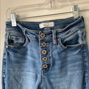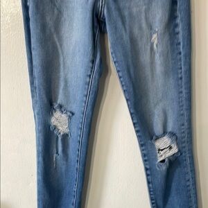 These KanCan blue straight leg jeans feature a light to medium wash with visible distressed areas, including a notable rip on the thigh. The high-waisted design offers a flattering fit, making them a stylish choice for casual wear.inseam 27 1/2 good condition