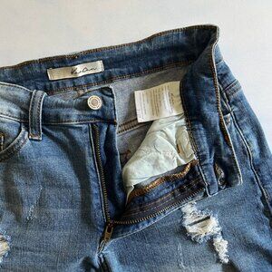 -Details: material is stretchy, leg folds are sewn in folded position, distressed, button & zipper closure, in excellent pre-loved condition