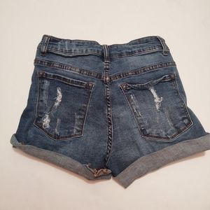 Medium wash distressed denim jean shorts. Rolled / cuffed bottom High rise / high waist