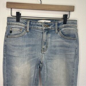 Light wash distressed KanCan jeans in size 9/28. These jeans feature classic KanCan stretch, flattering skinny fit, and stylish distressing throughout. Great for casual outfits, year-round wear. In good pre-owned condition with no major flaws.