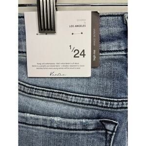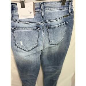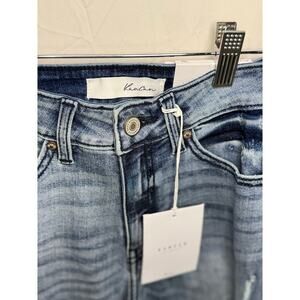 KanCan distressed skinny jeans in classic blue wash. Features a flattering mid-rise fit, light fading, ripped knees, and soft stretch denim for all-day comfort. Perfect for casual everyday wear with sneakers, sandals, or boots. Brand new with tags.