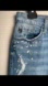 Trendy distressed skinny jeans. Features stylish rips and embellishments. Perfect for casual wear.