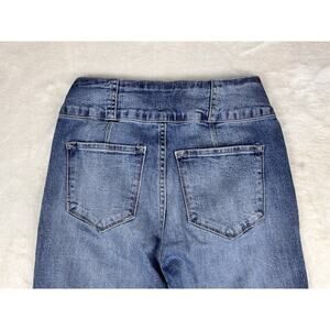 The KanCan Dunkirk jeans come in a size 5 with a waist size of 26 inches and an inseam of 31 inches. The jeans are made with a blend of spandex, cotton, and cotton blend materials that provide a shaping and stretchy fit. The solid blue color and logo accents make for a chic and versatile addition to your wardrobe.