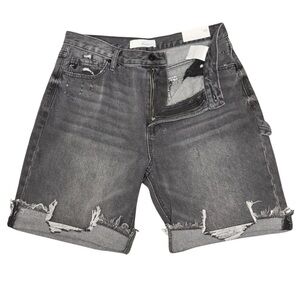 These KanCan black jean shorts feature a stylish distressed hem, offering a modern and edgy look. Crafted from high-quality denim, they provide comfort and durability for everyday wear. Perfect for casual outings, these shorts are a versatile addition to any wardrobe.