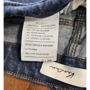 The product is a pair of KanCan Estilo Jeans in size 5/26. These distressed jeans feature a button fly, dark wash, and ankle length. The blue color and regular fit make them a stylish and versatile choice for women looking for a trendy denim option. With the brand's reputation for quality and the unique distressed detailing, these jeans are sure to be a fashionable and flattering addition to any wardrobe.