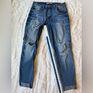 Chic KanCan jeans with a faded denim look. Features stylish distressing on the front. A1