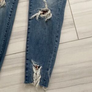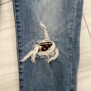 KanCan skinny jeans with leopard backed distress patches.