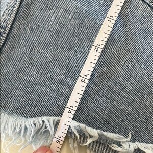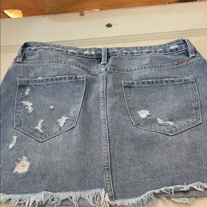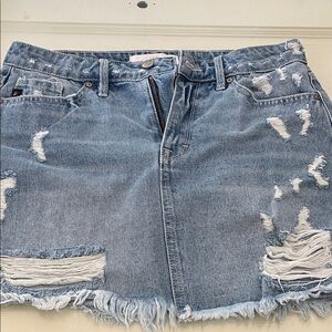Chic distressed mini skirt by KanCan. Light blue denim with frayed hem. Casual and stylish.