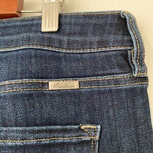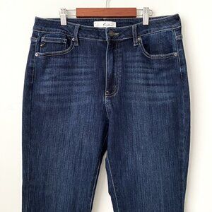 KanCan Marietta Bootcut Flare Jeans in size 31. Dark wash. High rise. Fitted through thighs and flare cut leg. Subtle fading and whiskering. Five-pocket design. Zip fly and button closure. Stretch denim fabric. 66% cotton, 30% polyester, 3% rayon, 1% spandex. Excellent pre-owned condition.