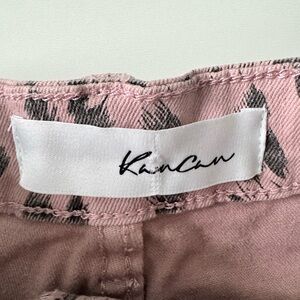 These KanCan jean shorts feature a fun pink and black leopard print, offering a bold and trendy look. Made from durable denim, they have a high-waisted fit and a frayed hem for a casual, stylish appearance. Perfect for adding a pop of color to your summer wardrobe.