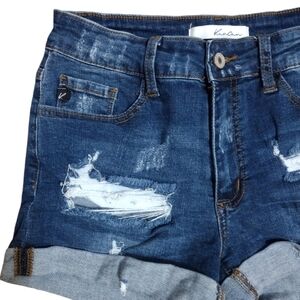 5 pocket shorts. Rolled Hem. Heavy Distressing. Mid Rise. Button and zipper closure.