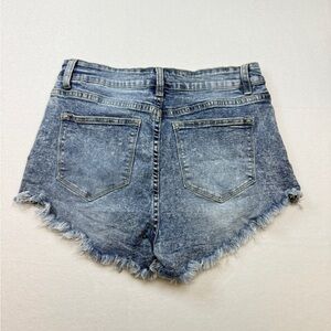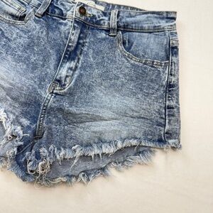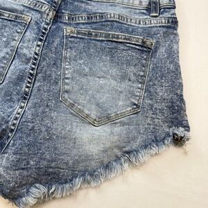 These KanCan jean shorts feature a high-waisted design with a distressed finish, offering a stylish and vintage look. The blue denim is treated with an acid-wash for a unique mottled appearance, while the raw, frayed hem adds a trendy cut-off style. Perfect for casual outings, these shorts provide a fashionable edge to any outfit.