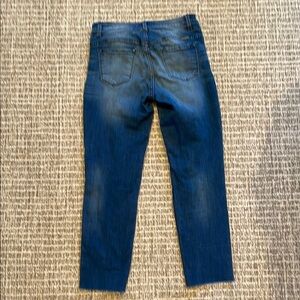 These KanCan blue skinny jeans feature prominent rips on the knees and fraying at the bottom, enhancing their distressed look. The medium blue denim showcases a stylish gradient fading effect, making them a trendy addition to any outfit. Sz 9