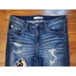 Experience the perfect blend of style and comfort with KanCan's mid-rise skinny jeans in a versatile blue hue. Crafted from a quality mix of cotton, polyester, and spandex, these jeans are designed to flatter your figure while ensuring a comfortable fit throughout the day. These jeans are distressed and ripped as shown in pictures. The size 11/29 waist pairs with a 29-inch inseam to create a tailored look that's just right for any occasion. Details such as the distressed look with animal print patching and a functional 5-pocket design add practicality to this fashionable piece. Whether you're out on the town or enjoying a casual day, these jeans offer a stretchy fit that moves with you. Machine washable for easy care, they're an essential addition to your wardrobe that transcends seasons.