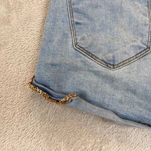 These KanCan denim shorts, crafted from a comfortable cotton-polyester blend with a touch of spandex, offer a stylish light wash and rolled cuffs. Gold chain accents add a unique flair, making them a standout addition to casual wardrobes. Perfectly sized at 3/25, these shorts combine form, function, and fashion effortlessly.