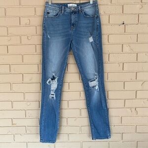 KanCan Women's Mid Rise Distressed Skinny Jeans Medium Wash Size 26 stretch. Excellent condition with no flaws. Perfect amount of stretch and distressing. See measurements in pictures
