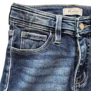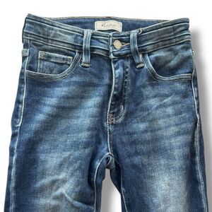 These KanCan women's ankle jeans in size 23 feature a slim fit and a classic 5-pocket design. Made from a blend of cotton, rayon, and spandex, they offer a comfortable mid-rise fit with a medium fabric wash. The jeans are blue with distressed accents and include a button and zip fly closure with belt loops. This pre-owned item is in great condition.