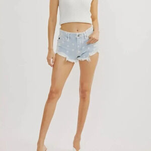 KanCan Women's Mid-Rise Polka Dot Frayed Hem Denim Shorts Size Small Blue
