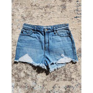 KanCan Women's Size 27 Medium Wash Frayed Hem Denim Shorts