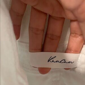 Chic white denim shortalls. Ideal for casual wear. Features adjustable straps and front pocket.