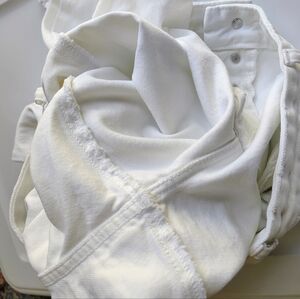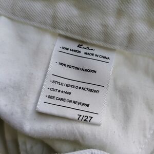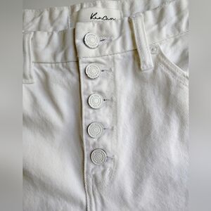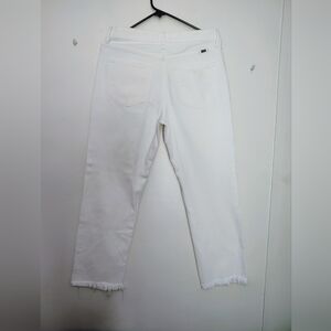 Experience effortless style with KanCan's white cropped ankle jeans. These jeans feature a clean, minimal design with a mid to high-rise waist, perfect for versatile casual wear. The crisp white denim and frayed hem offer a fresh look ideal for any season.KanCan jeans women's straight leg frayed hem buttons at fly, cropped white size 7/27, high rise, 100% cotton, 5 pockets, 28 inch inseam, 38 inch length, 30 inch waist, casual outfits, closes with buttons, buttons a little torn look closely at photographs please, clean garment in excellent condition.