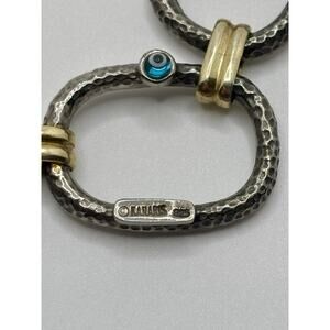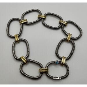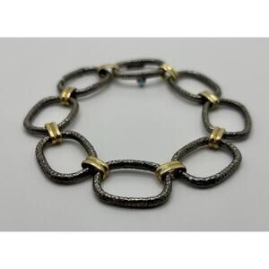 Take a look at this beautiful Kanaris designer oval link bracelet. These don’t come up for sale very often. This bracelet has a total length of 9.25”. It has textured oval links that are antiqued color connected by a fluted gold over silver link. It has a hidden hinged closure on the end link. This bracelet is in great condition. Thanks for looking and let me know if you have any questions.