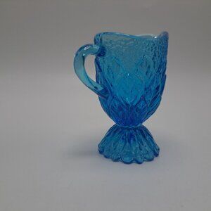 Add a touch of vintage charm to your decor with this blue pressed glass miniature pitcher or toothpick holder. Its intricate design stands out.