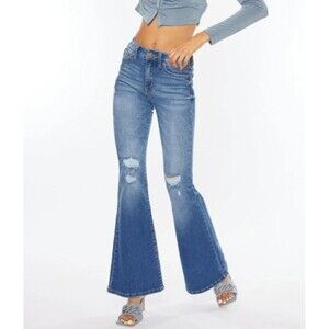 The Kancan Blue Jeans are a stylish and versatile choice for women. These flare high rise jeans feature a distressed stretch denim fabric, making them comfortable and easy to care for. These KanCan jeans are perfect for any season, whether you're going for a hipster, bohemian, or retro look.