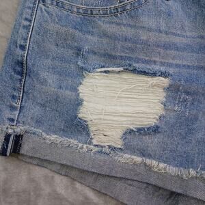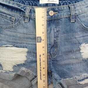 Kancan Distressed Denim Jean Shorts Women's Size Large W28 Blue Cuffed Mid Rise 3" Destroyed with frayed hole details, fixed rolled raw hem cuff and a stonewash style fade.