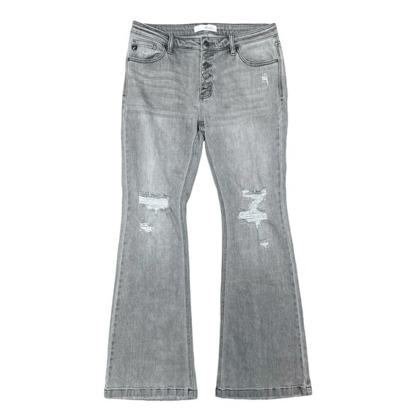 Kancan Harlo Mid Rise Flare Jeans Light Gray Knee Holes Size 13/30