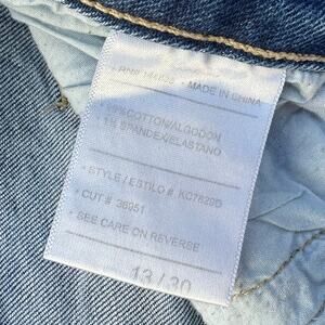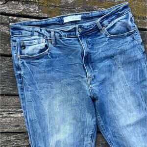 Kancan High Rise Mom Fit Jeans, style KC7829D, in acid wash blue. Women’s size 13/30, pre-loved and in excellent used condition. These jeans feature a flattering 12" rise, rolled ankle hem (25" inseam rolled, 27" unrolled), and a flat lay waist of 18".