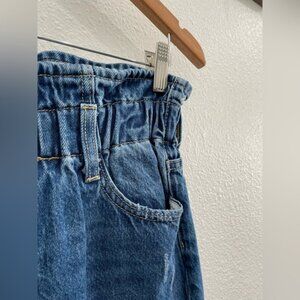 Contemporary high waisted stretch paperbag relaxed jeans with elastic waistband