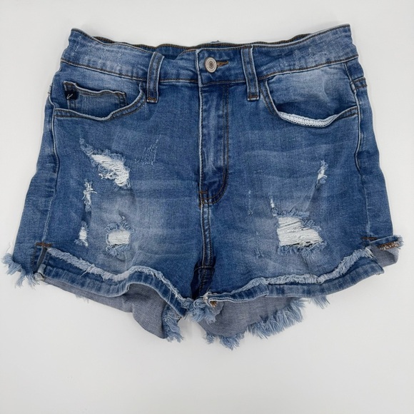 Style: Kancan Jean Shorts Womens 7* Blue Denim Stretch Distressed Mid Rise Cut Off