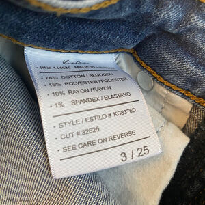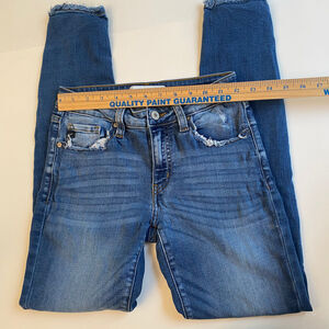 Elevate your denim collection with these KanCan skinny jeans in a modern blue wash. These pre-owned jeans feature a mid-rise fit with a slim cut, crafted with a stretchy cotton blend fabric for comfort. The button and zipper accents on these pants give them a trendy feel, while the dark wash finish adds a touch of sophistication. These juniors' jeans come in a size 3/25 , making them perfect for a casual day out or a night on the town. These denim pants are machine washable and easy to care for, making them a versatile addition to any wardrobe.